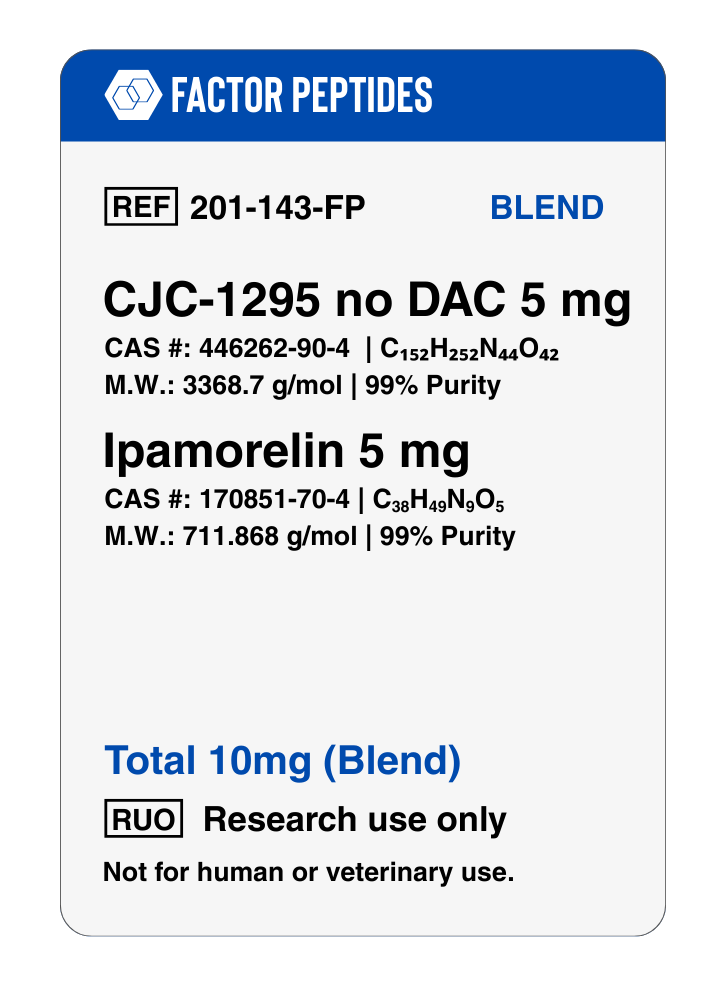 The information above is provided for scientific and educational purposes only. Ipamorelin and CJC-1295 are not approved medicines or drugs and have not been evaluated by the FDA or any other regulatory agency to diagnose, treat, cure, or prevent any disease or medical condition. These compounds are supplied solely for in-vitro and other approved laboratory research applications and are not intended for human or animal