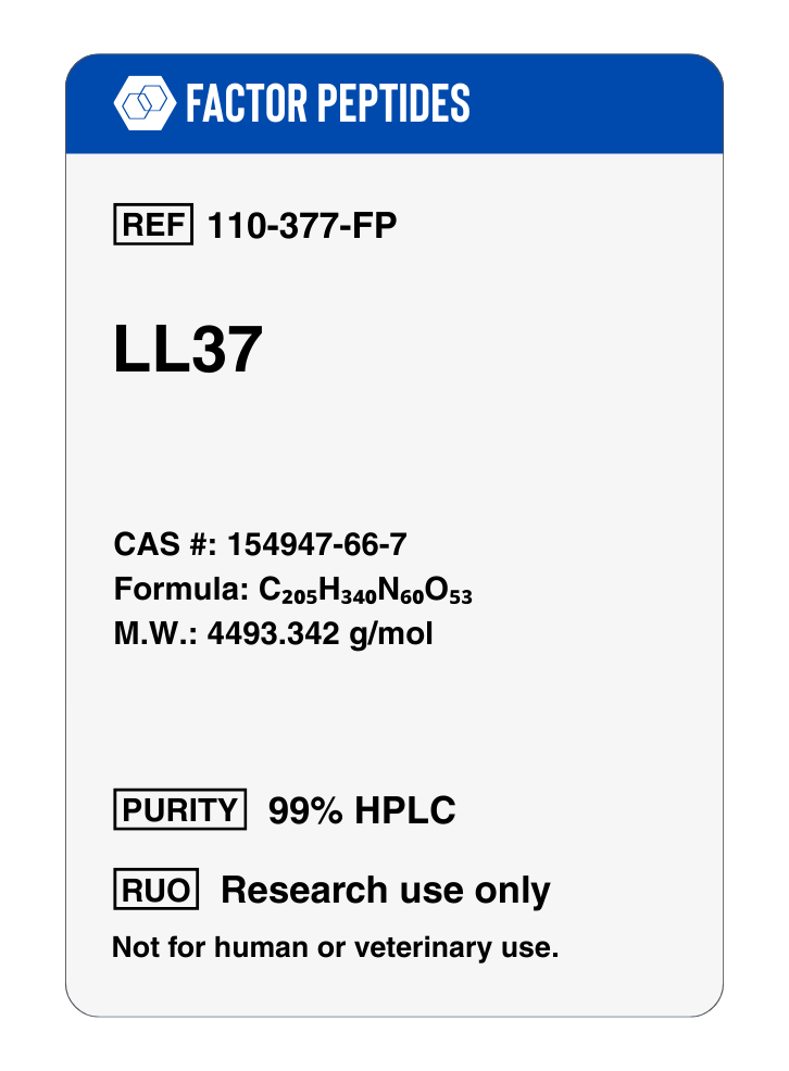 LL-37 is the only known human cathelicidin and a member of a large family of antimicrobial peptides (AMPs). These peptides are primarily produced by macrophages and polymorphonuclear leukocytes where they contribute to first line defense against pathogens. Beyond direct antimicrobial activity, LL-37 has been implicated in autoimmune disease, cancer biology, wound repair, and tissue homeostasis.